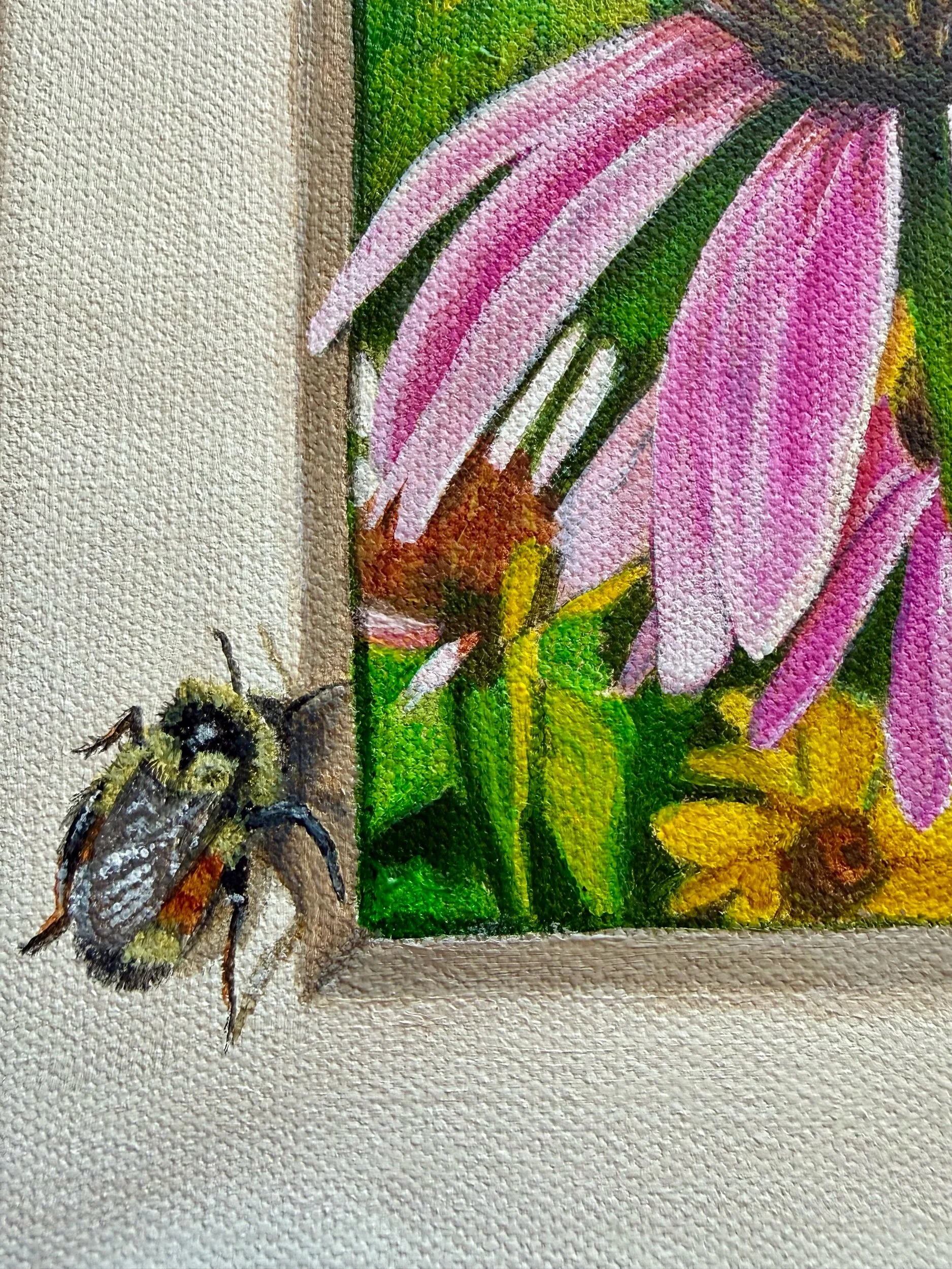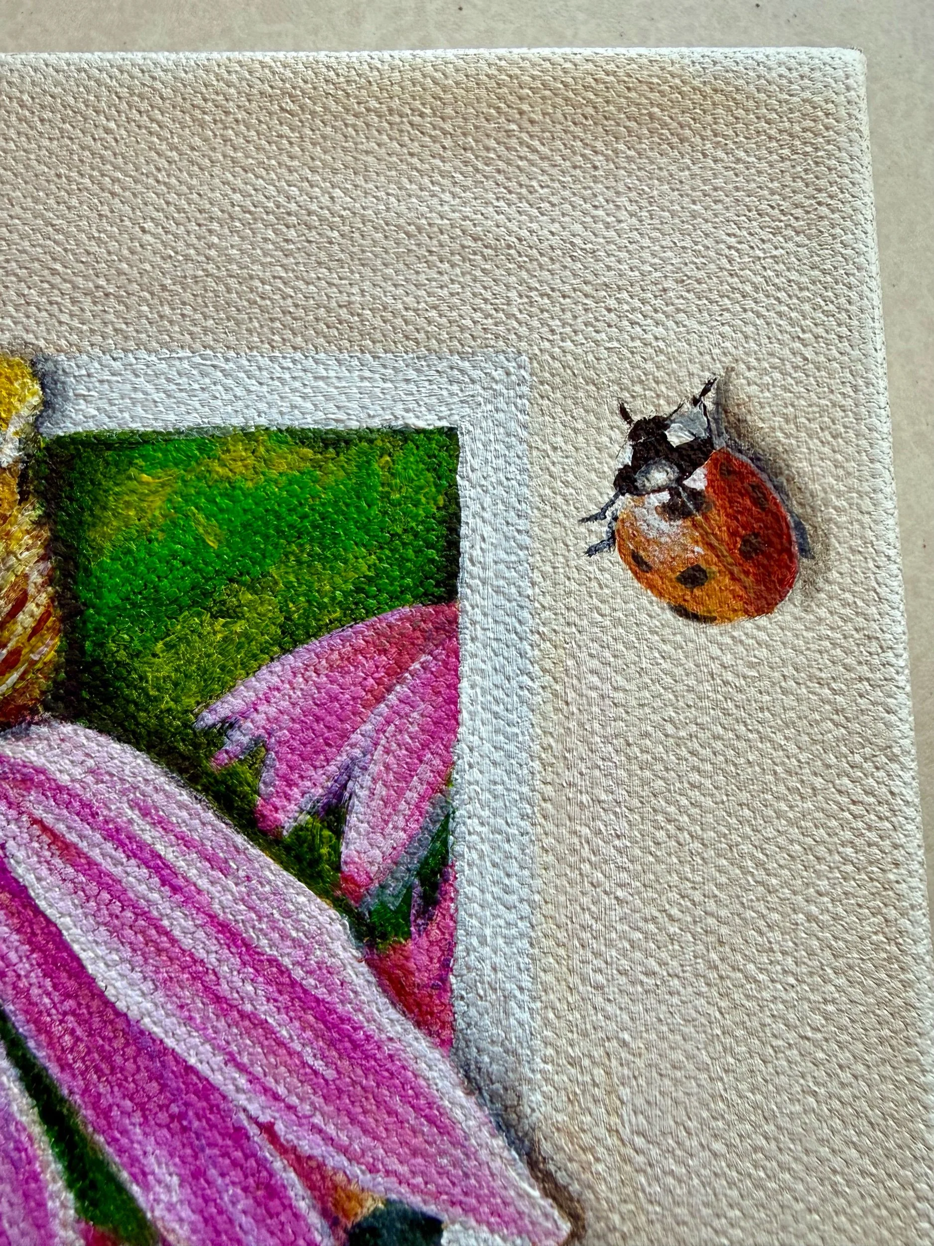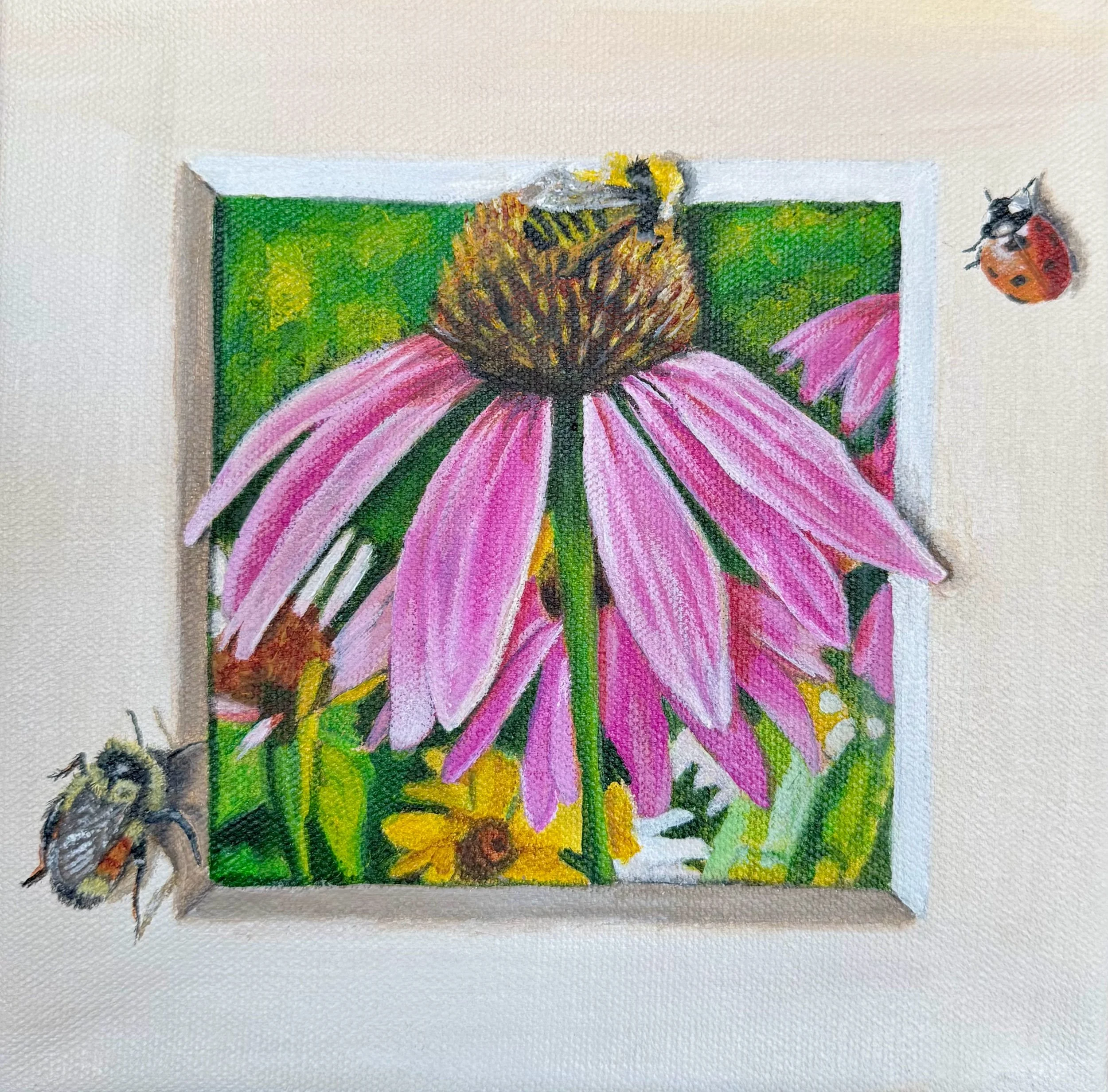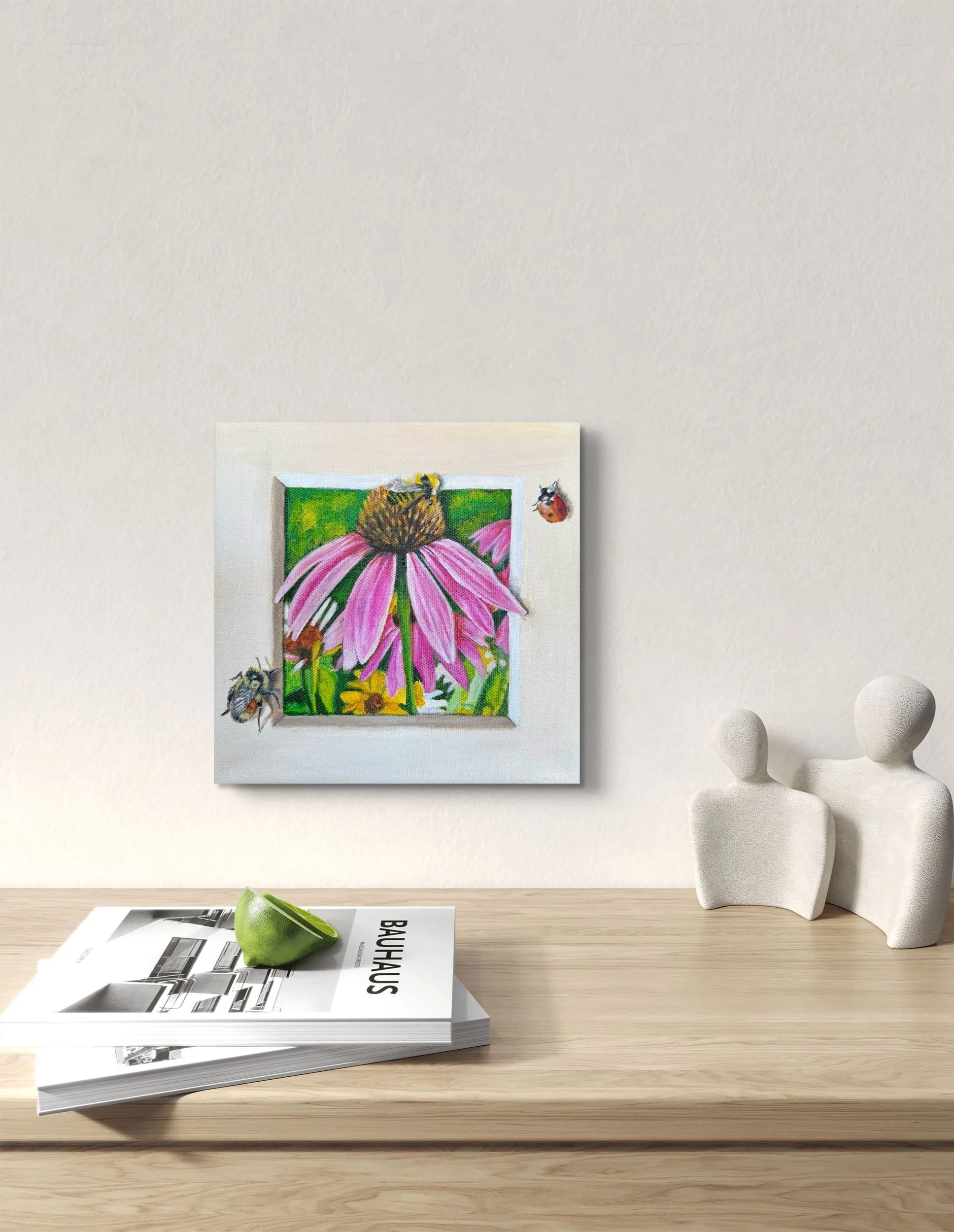Bring the vibrant energy of a summer morning indoors. This piece features a stunning pink coneflower in full bloom, captured in a unique "break-through" style where the garden’s visitors, busy bees and a lucky ladybug, spill out beyond the canvas edges. It’s a playful, dimensional tribute to the pollinators that keep our world in bloom.